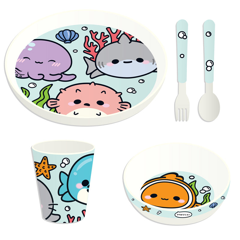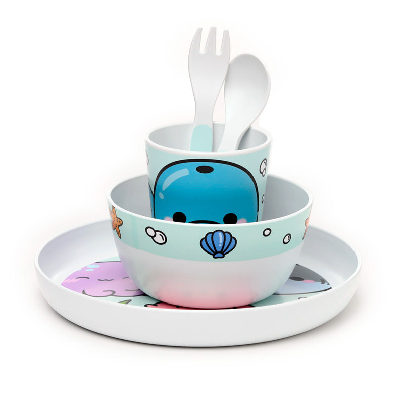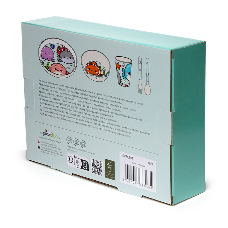 Litríkt og skemmtilegt matarsett úr endurunnu plasti sem inniheldur 5 hluti.