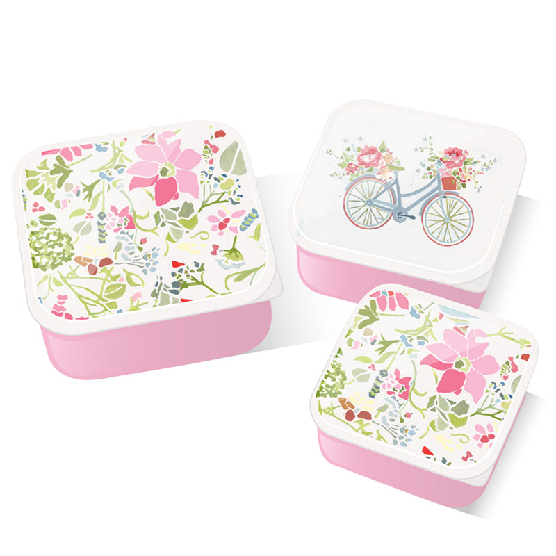 Sett með þremur litríkum nestisboxum úr Julie Dodsworth Pink Botanical línunni.