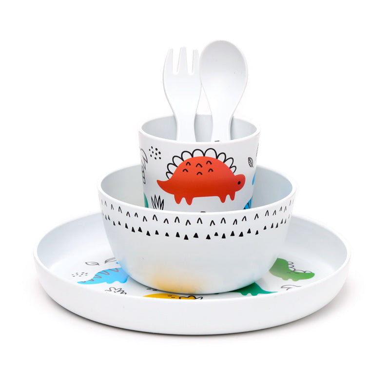 Litríkt og skemmtilegt matarsett úr endurunnu plasti sem inniheldur 5 hluti.