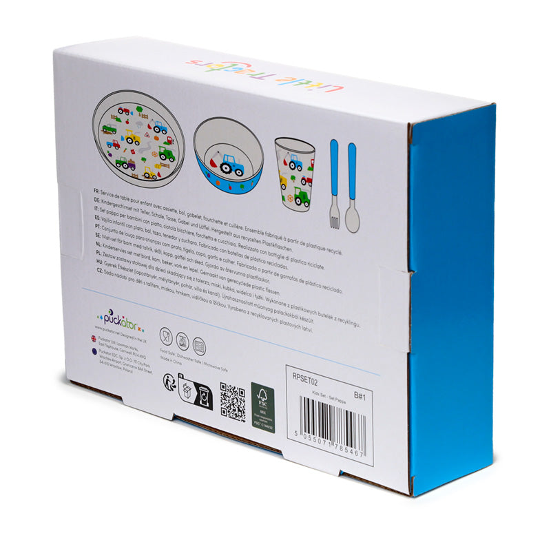 Litríkt og skemmtilegt matarsett úr endurunnu plasti sem inniheldur 5 hluti.